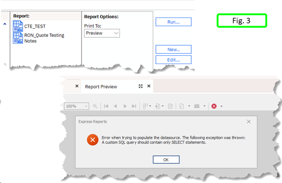 CTE query failing on report printing Symptom: Reports containing CTE (Common Table Expression) SQL queries failed to generate when previewed from the Report Designer or run via the User Reports menu, even though the same queries executed successfully through Manage Queries in the SQL Editor. Resolution: Updated the report execution pipeline to correctly handle CTE-based SQL queries during report preview and runtime. |